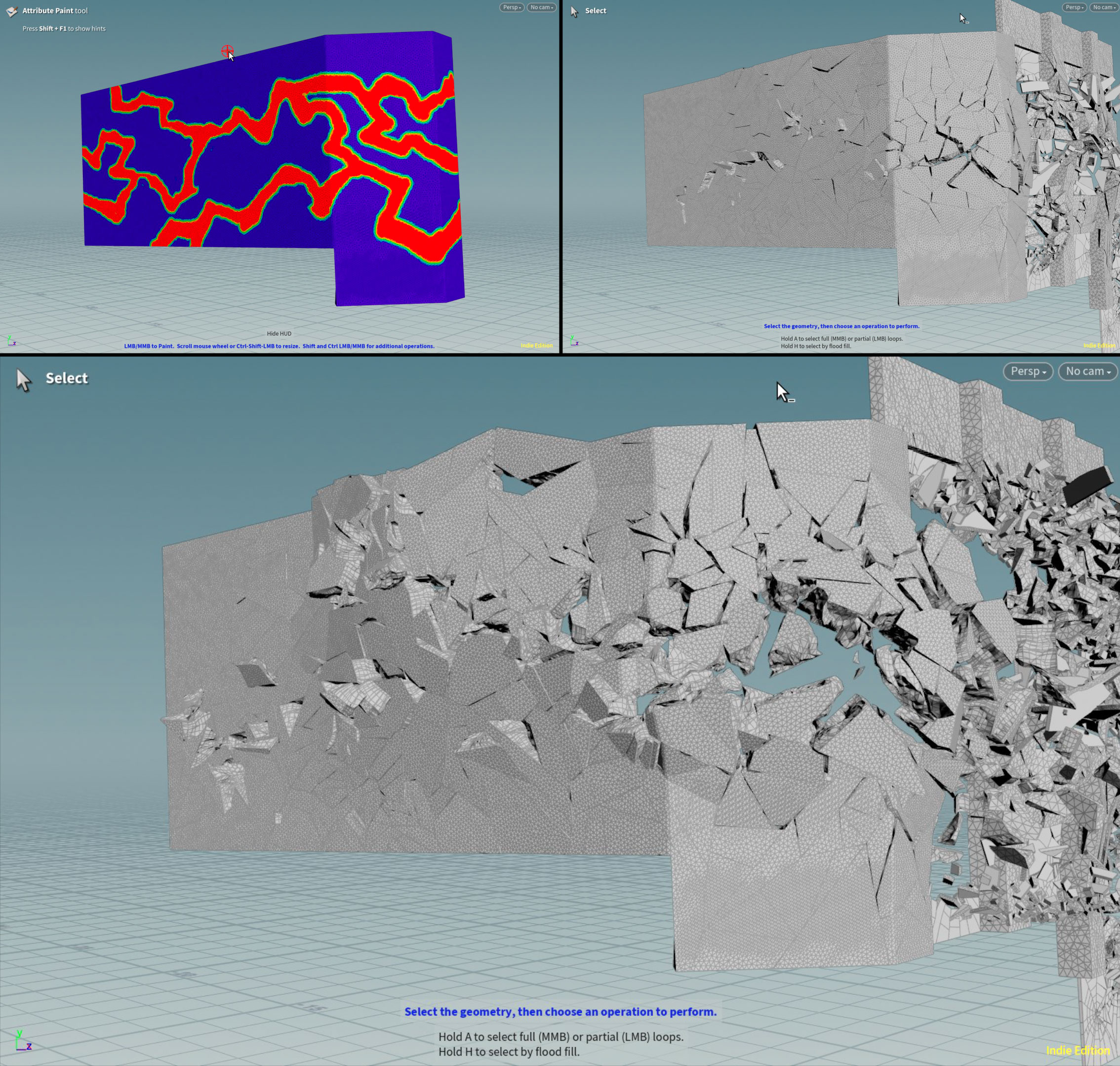 I liked the look of the vellum based fluid getting pushed through the cracks and forming lots of different organic fluid shapes. Here the fluid started as simple geometric shapes but because of the interaction with the fractures it ended up getting split into lots of very natural and varied shapes.