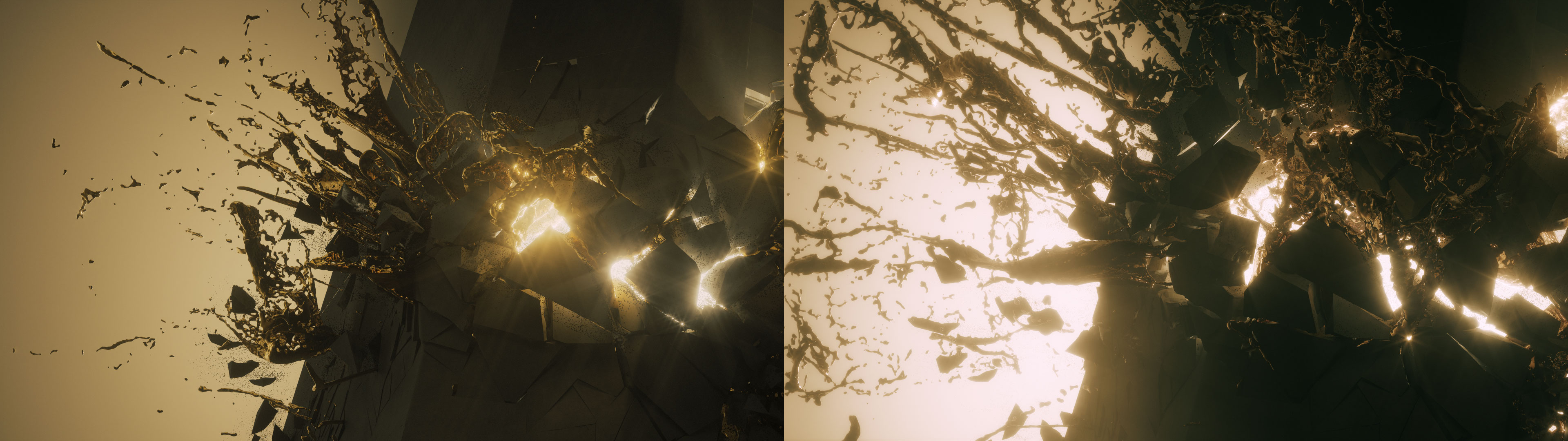 This was an early test I did which gave me confidence that shining a bright volumetric light from inside the cracks would be a good look. Below are some more stills of the same lighting approach applied later on in the process.